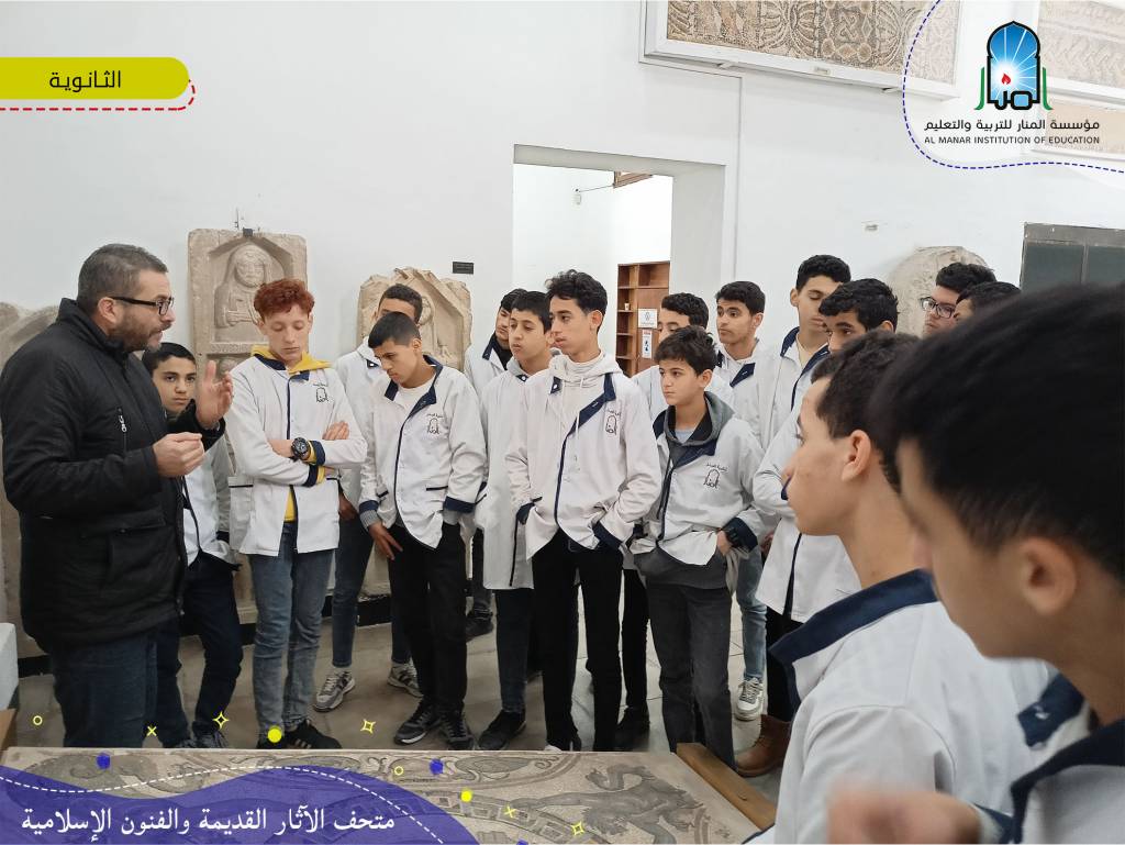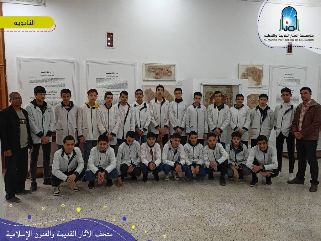 سعيا لرفع مستوى الوعي لدى أبنائنا الطلبة، وتقريبا للدورس المقرّرة إلى واقع التلاميذ، وتحقيقا للكفاءات المتناولة في مادة التاريخ والجغرافيا نظمت ثانوية المنار-2- رحلة علمية إلى متحف الآثار القديمة والفنون الإسلامية لفائدة طلبة قسم الثانية ثانوي، وذلك يوم الخميس الفارط 02 فيفري 2023م، حيث جال بهم المرشد أنحاء المتحف المقسم إلى قسم الآثار القديمة وكيف كان يعيش الإنسان القديم مذ الحضارات الشرقية القديمة، ثم انتقل بهم إلى قسم الفنون الإسلامية انطلاقا من الدولة الرستمية والآثار المستعملة في ذلك الوقت إلى الدولة العثمانية وماتركته من فنون وتقاليد معبّرة..