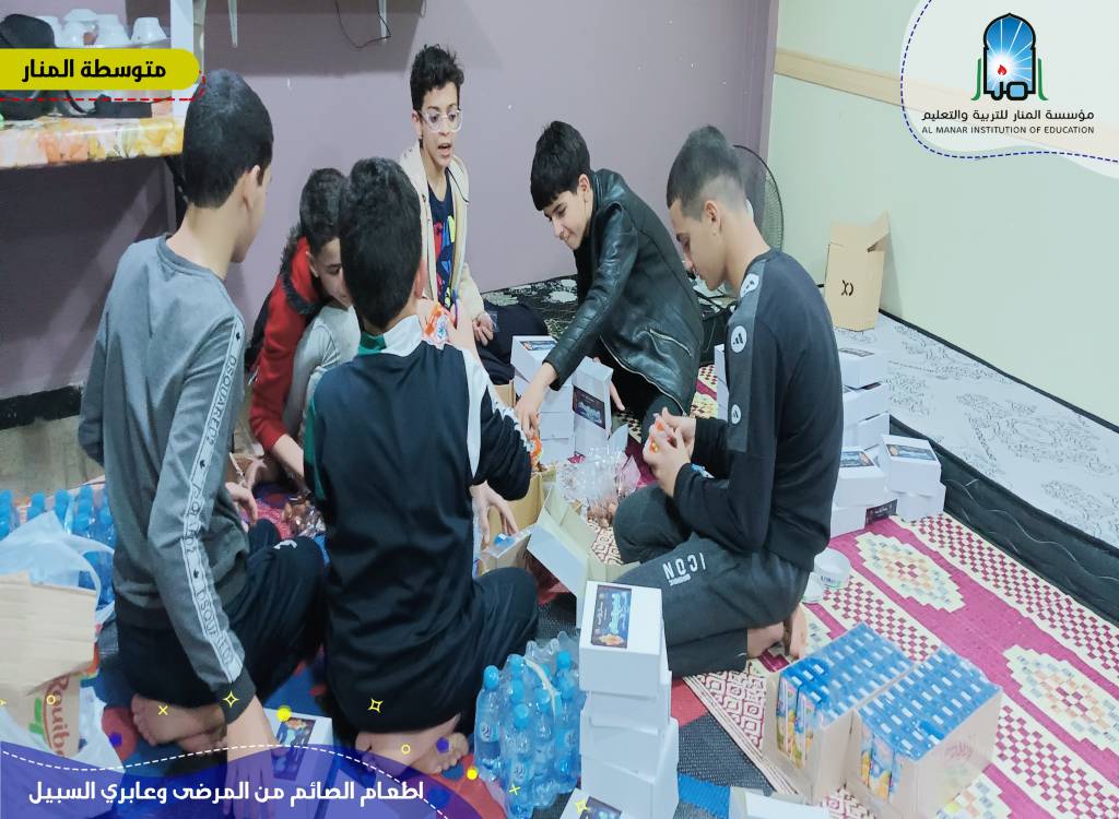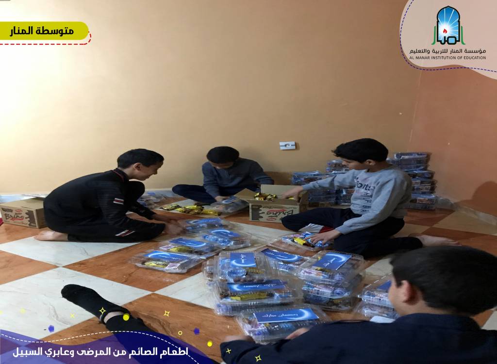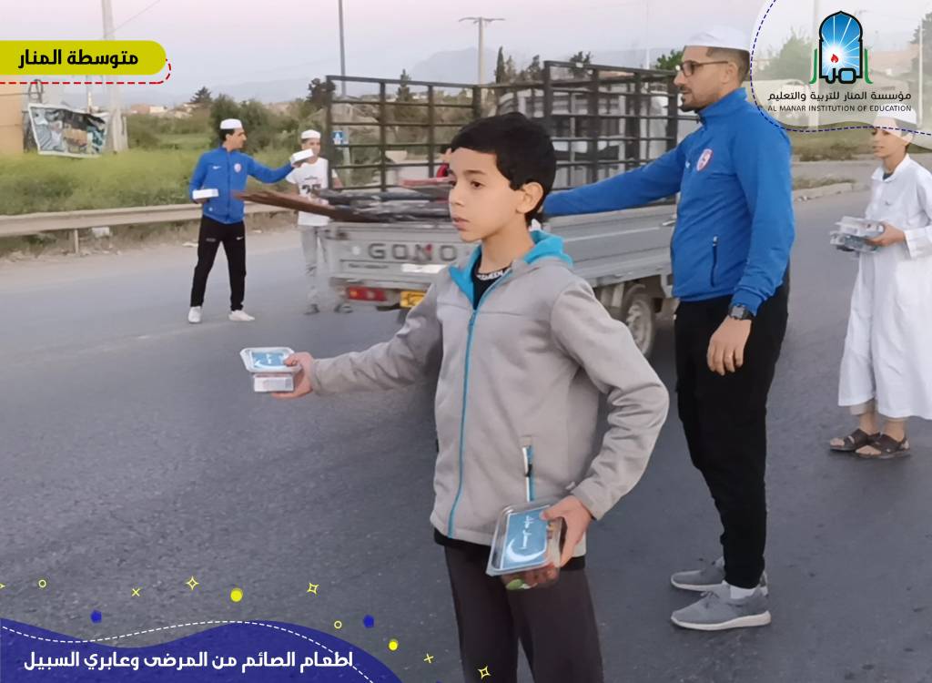 قال الله تعالى: "وَيُطْعِمُونَ الطَّعَامَ عَلَى حُبِّهِ مِسْكِيناً وَيَتِيماً وَأَسِيراً * إِنَّمَا نُطْعِمُكُمْ لِوَجْهِ اللَّهِ لاَ نُرِيدُ مِنكُمْ جَزَآءً وَلاَ شُكُوراً * إِنَّا نَخَافُ مِن رَّبِّنَا يَوْماً عَبُوساً قَمْطَرِيراً* فَوَقَاهُمُ اللَّهُ شَرَّ ذَلِكَ الْيَومِ وَلَقَّاهُمْ نَضْرَةً وَسُرُوراً* وَجَزَاهُمْ بِمَا صَبَرُواْ جَنَّةً وَحَرِيراً* " إن في اطعام الصائم من عابري السبيل والمرضى مغانم كثيرة خاصة في شهر رمضان المعظم. وكيف لنا ألا يكون لنا نصيب من تلك المغانم من مغفرة وأجر وثواب. وطمعا من التلاميذ في نيل الأجر وتحقيق التوفيق الدنيوي والأخروي، نظموا بالتنسيق مع متوسطة المنار وبعض الجمعيات المحلية ثلاث مشاريع اطعام الصائم من المرضى وعابري السبيل خلال أمسيتي يوم الأحد والإثنين 25 و26 رمضان 1444هـ - 16 و17 أفريل 2023م. تم من خلالها توزيع 1100 وجبة. أشرف التلاميذ في مجموعات: مجموعة "رواد الخير" ومجموعة “وافعلوا الخير” ومجموعة “هلال رمضان”، على المشاريع من جمع الموارد من تبرعات ومواد غذائية وترتيبها في علب، إلى توزيعها تحت مرافقة الأساتذة والإدارة حسب التالي: مجموعة "روّاد الخير": نقطة دوران حمادي. مجموعة "هلال رمضان": مستشفى رويبة مجموعة "وافعلوا الخير": محطة المسافرين خروبة. نشكر مؤسسة السلام وفريق الوحدة الرياضي وكل الأولياء على المساهمة والمرافقة والدعم. تقبّل الله منا ومنهم سائر العبادات وأعمال الخير وأثابنا وإيّاهم خير الثواب والمغفرة. الهدف من هذا البرنامج هو تعويد التلميذ على فعل الخير والصدقة والانفاق في سبيل الله وحب الخير حتى يساهم هو أيضا مستقبلا في بناء وطنه ومجتمعه من خلال اكتساب هذه القيم.