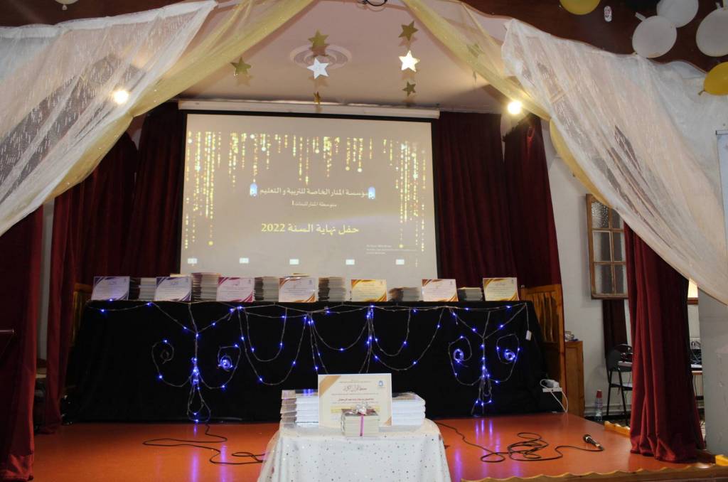 لكل بداية مشرقة انجازات مثمرة ولكل جد وكفاح فوز وفــــــلاح تم ولله الحمد والمنة حفل ختام الموسم الدراسي لمتوسطة المنار يوم الثلاثاء 14 من ذي القعدة 1443ه / 14جوان 2022م.. تنافست الطالبات في الحفل بتقديم أجمل الأنشطة وباختيار أروع الكلمات.. بمشاركة مبهجة للإدارة العامة لمؤسسة المنار للتربية والتعليم ممثلة في رئيس المؤسسة.. وبحضور مبهر للأولياء آباء وأمهات.. وقد مرّ الحفل بأروع المحطات من افتتاح بآيات بينات وكلمات تنشطية وتحفيزية وأنشطة بمختلف اللغات عربية وفرنسية وإنجليزية، تخلّله عرض ملخّص يصوّر للحاضرين بعض أنشطة الموسم.. والمحطات الأهم في الحفل تكريم المستظهرة لكتاب الله والخاتمات له وكل الناجحات بالامتياز والتهنئة والتشجيع ولوحة الشرف.. ندعو الله الصلاح والسداد لبناتنا ودوام الرقي لمؤسستنا.