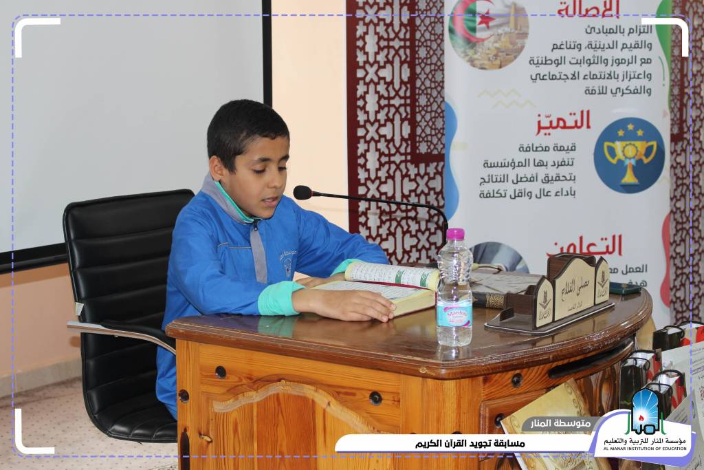 في إطار تشجيع أبناءنا التلاميذ على حفظ القرآن وتجويده، فقد احتضنت متوسطة المنار فعاليات نهائي مسابقة تجويد القرآن في طبعتها الأولى تحت عنوان "بالقرآن نحيا" والتي نظمتها مؤسسة المنار للتربية والتعليم لفائدة تلاميذ المؤسسة وذلك يوم الثلاثاء 28 شوال 1445ه الموافق ل 07 ماي 2024 م حيث جرت التصفيات بين المتأهلين إلى الدور النهائي وقد سهر على تقييم المشاركين لجنة مكونة من أساتذة أفاضل من قسم الإجازة الأستاذ بوسعدة عمر بن أحمد والأستاذ ميوريغ داود بن محمد حفظهم الله حيث استفاد التلاميذ من نصائح لجنة التقييم وكذا من تدخلات الأساتذة الكرام بتوجيهاتهم ونصائحهم القيمة.